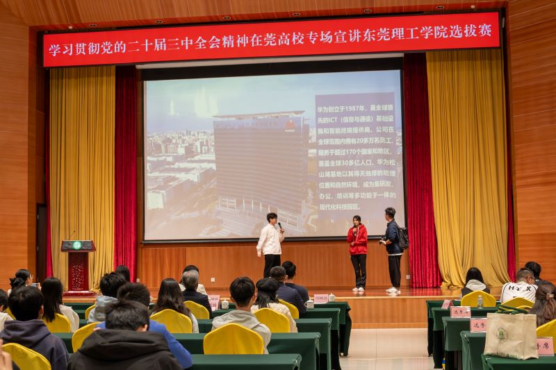 12月12日,学习贯彻党的二十届三中全会精神在莞高校专场宣讲选拔赛在我校松山湖校区学术会议中心举行。由校内各单位遴选推荐的12组青年宣讲员们紧密结合自己的成长经历、求学故事、实践思考,以丰富多样的形式,从不同角度分享了自己对党的二十届三中全会精神的理解和感悟。东莞市委宣传部有关负责同志,学校宣传部、马克思主义学院有关负责人以及学生代表等参加本次活动。