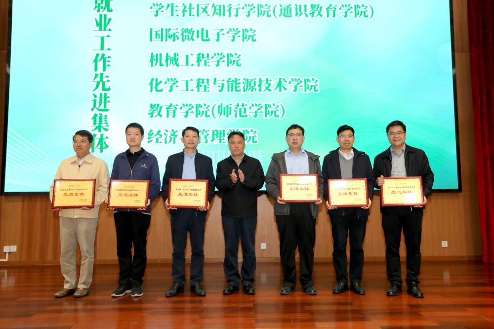 会上还颁发了毕业生就业基地牌匾,表彰了2024年学校就业工作先进集体和先进个人,就业创业与校友工作部负责人作2025届毕业生就业工作推进情况介绍,东莞新能德科技有限公司作为企业代表进行了交流发言,化学工程与能源技术学院和机械工程学院分别作为二级学院代表介绍了本科生、研究生就业创业的工作经验。