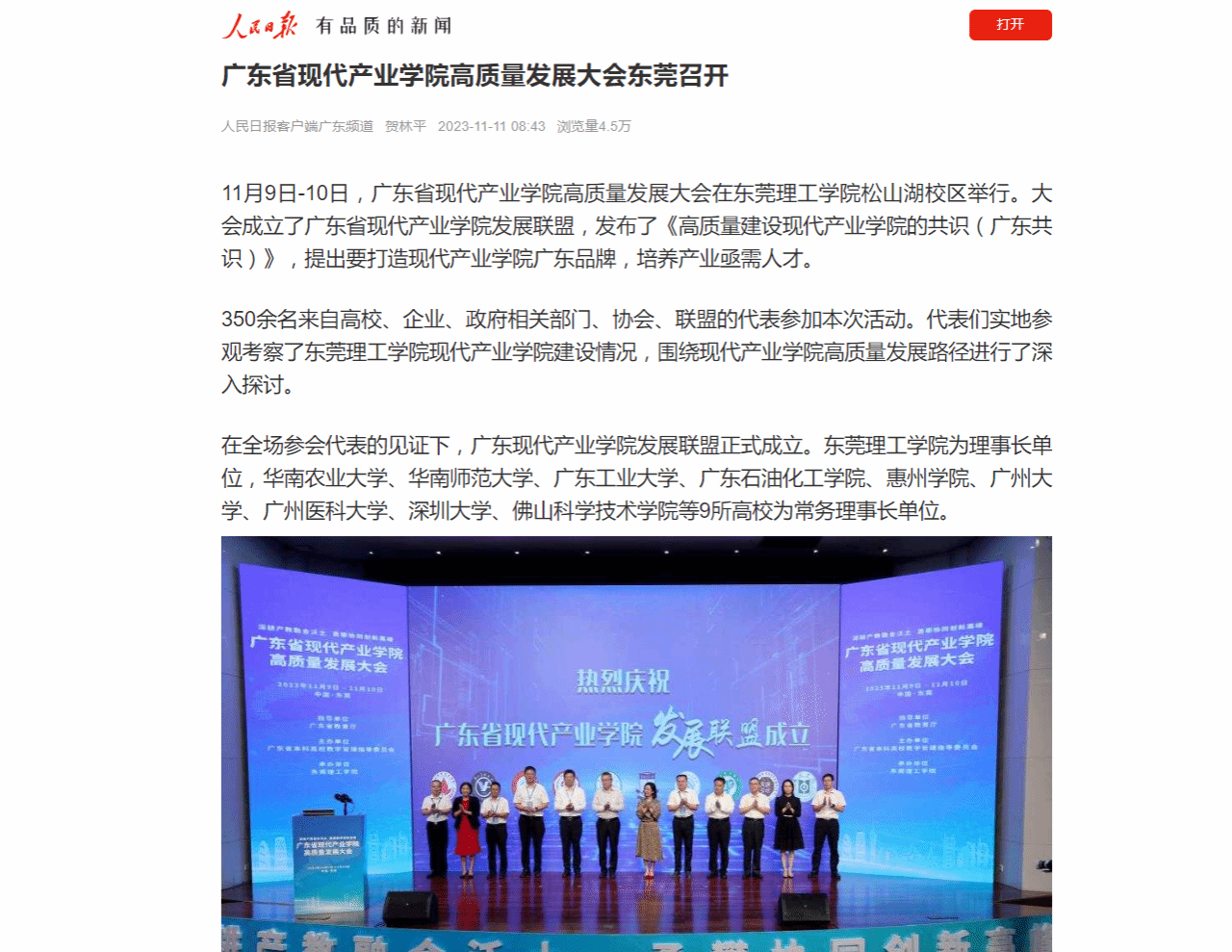 11月9日-10日,广东省现代产业学院高质量发展大会在九九精品视频一区在线久久久久久久久久毛片精品美女|国产99久久久久久免费看|中文精品99久久国产|国产69精品久久久久9999|精品久久久久久中文字幕无码|亚洲熟妇无码久久精品国产精品99|精品国产天堂综合一区在线松山湖校区举行。大会成立了广东省现代产业学院发展联盟,发布了《高质量建设现代产业学院的共识(广东共识)》,提出要打造现代产业学院广东品牌,培养产业亟需人才。