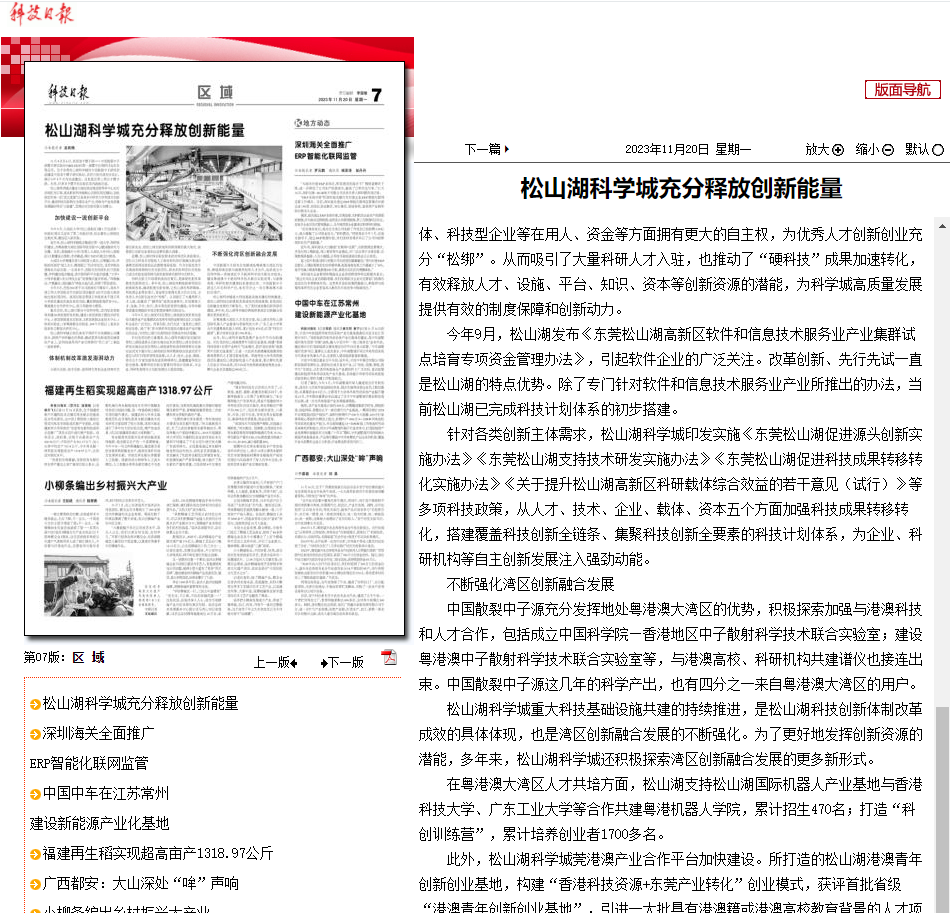 科研创新工作取得新成效的背后,是体制机制改革焕发的澎湃动力。多年来,松山湖始终积极探索科技创新体制改革,推动制度创新发展,让松山湖的科研载体、科技型企业等在用人、资金等方面拥有更大的自主权,为优秀人才创新创业充分“松绑”。从而吸引了大量科研人才入驻,也推动了“硬科技”成果加速转化,有效释放人才、设施、平台、知识、资本等创新资源的潜能,为科学城高质量发展提供有效的制度保障和创新动力。